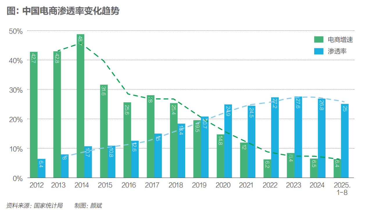 2024年2月,阿里巴巴董事长蔡崇信预测:未来五年中国电商的渗透率将超过40%,但接下来的数据走势正好相反。国家统计局数据显示,2024年电商渗透率从2023年的27.6%回落至26.8%,2025年1月至8月的电商渗透率更是停滞在25.0%。