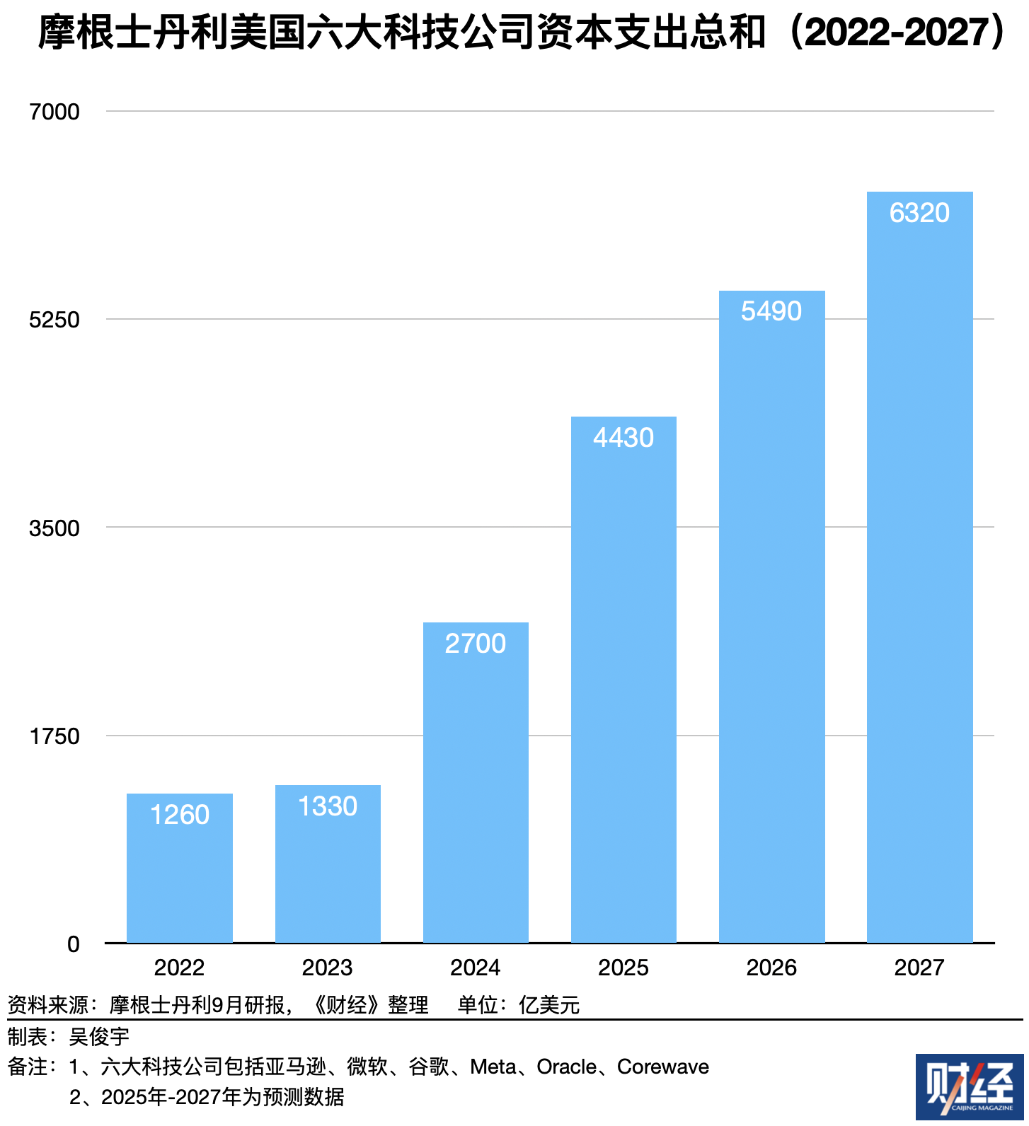 摩根士丹利数据今年9月研报显示,这六家科技公司2024年资本支出总额2700亿美元,预计2027年资本支出总额将高达6320亿美元。