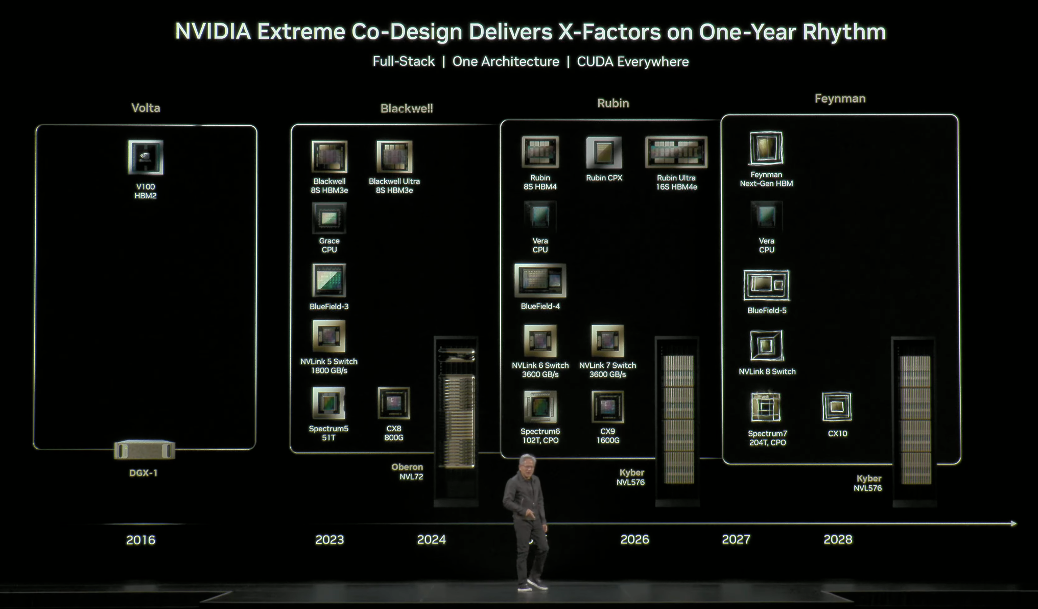 为此,黄仁勋公布了产品路线图——英伟达目前热销的是Blackwell系列芯片,将在2026年下半年量产下一代Rubin系列芯片,2027年-2028年将推出Feynman系列芯片。