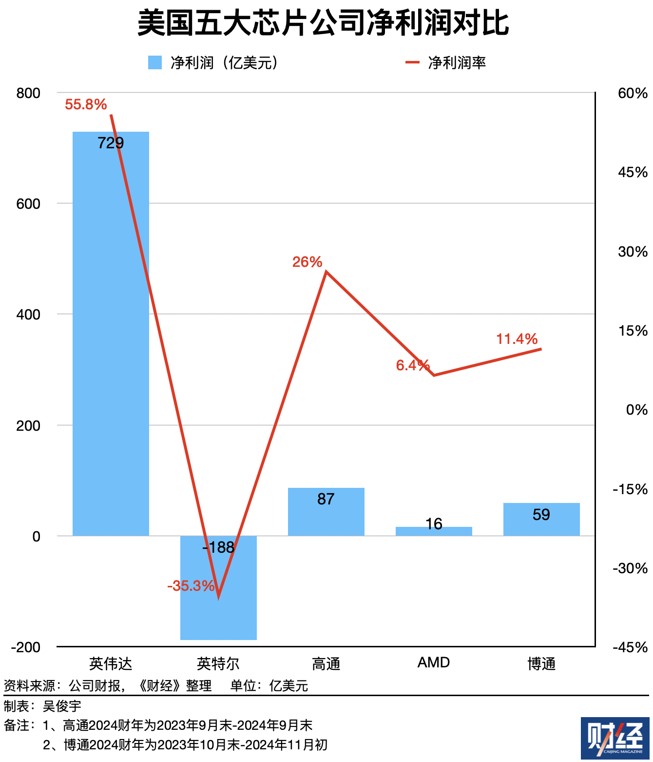英特尔2024年净利润-188亿美元,净利润率仅为-35.3%,高通2024财年(2023年9月末-2024年9月末)净利润87亿美元,净利润率仅为26.0%,AMD 2024年净利润16亿美元,净利润率仅为6.4%,博通2024财年(2023年10月末-2024年11月初)净利润59亿美元,净利润仅为11.4%。